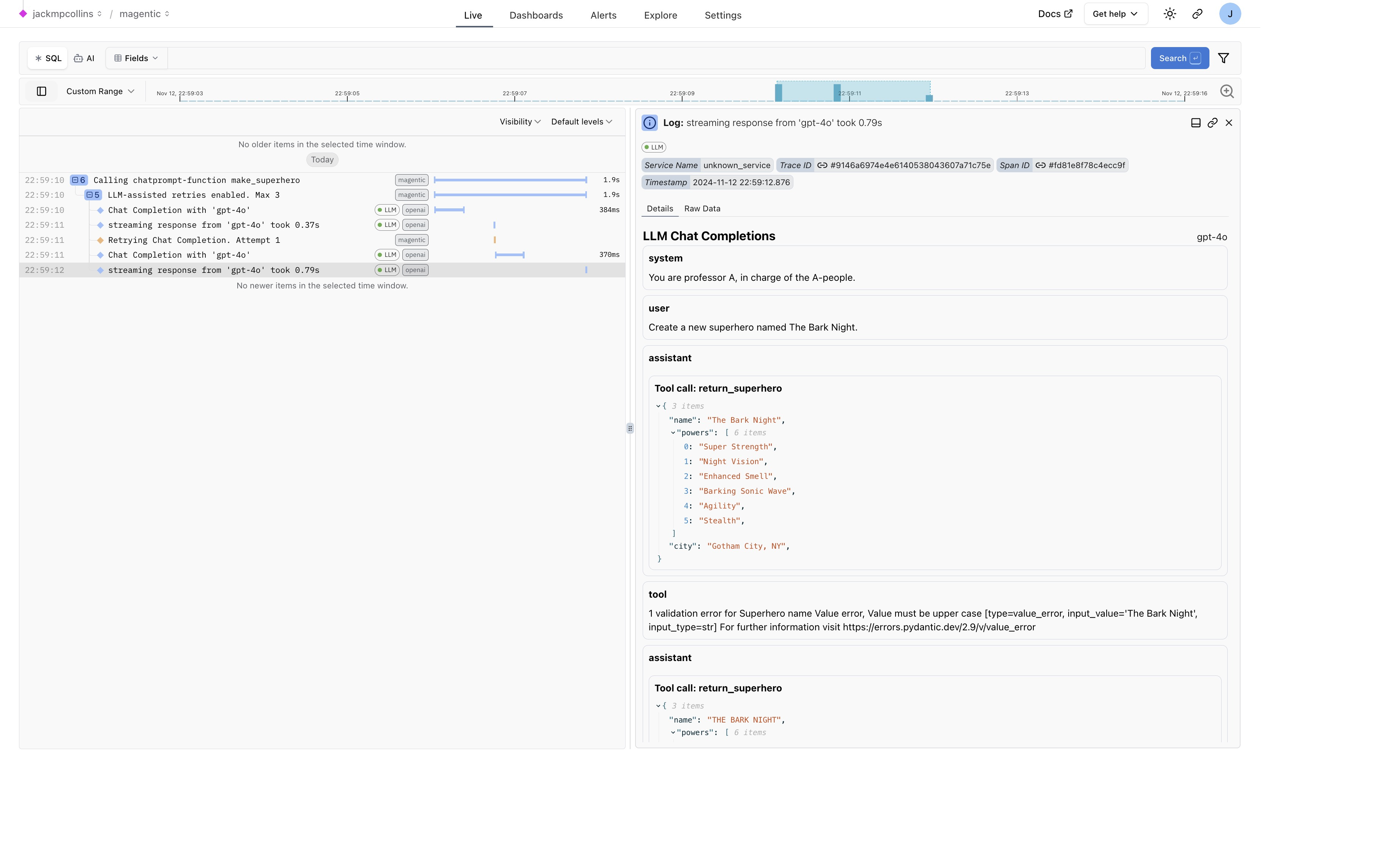make_superheroshowing the input arguments - A span showing that retries have been enabled for this query